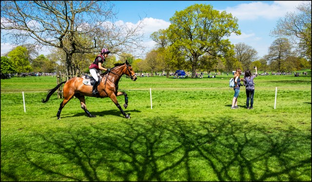 The tree shadow was the initial secondary subject of this shot of a horse galloping by during the 2018 Badminton Horse Trials. As it turned out another photograph was being taken at the same time.