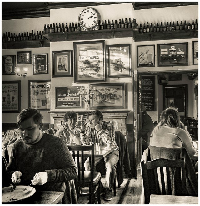 This picture was taken on an iphone in The Victoria, Beeston, Nottingham. The sunlight shines through the beer, whilst another customer polishes off his lunch.