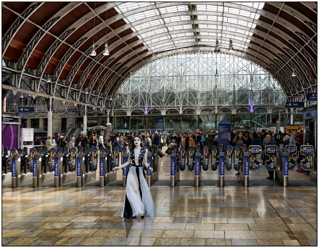 A timely moment for a photograph when all of the travellers had gone through the barrier. A model from a South Bank shoot has been superimposed onto a shot of Paddington Station, 2017.